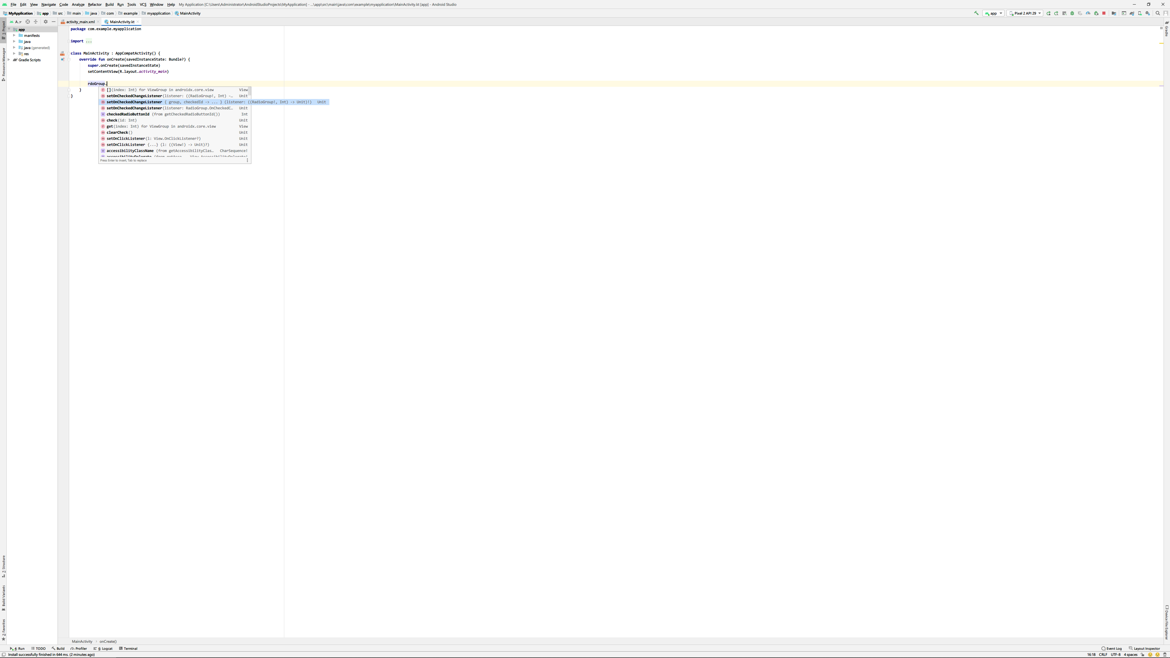코드 편집기에서 처음 rdoGroup까지 입력하고. 을 찍으면 다음과 같이 사용 가능한 목록이 나열될 것입니다. 이 목록 중에서 'setOnCheckedChangeListener { group, checkedId...' 부분을 선택한뒤 위 코드를 추가하면 됩니다.