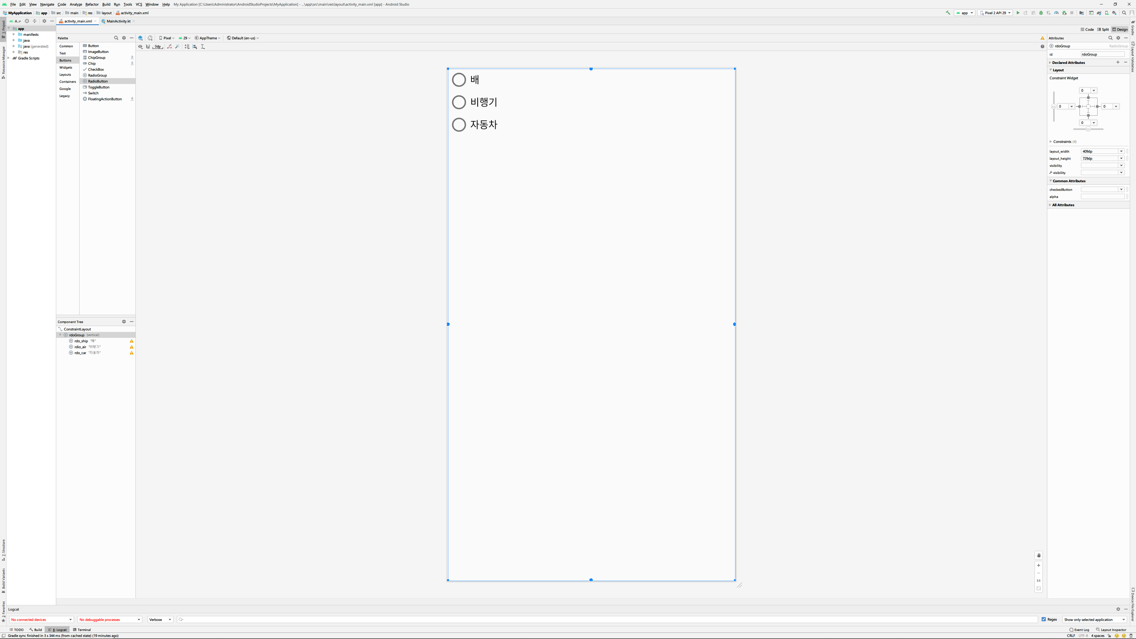 RadioGroup을 사용하기 위해 위젯을 디자인영역에 끌어다 놓으면 위와 같은 그림을 볼 수 있습니다. 이 상태에서 RadioButton을 방금 추가한 RadioGroup위에다가 끌어다 놓은 후 RadioGroup의 ID는 rdoGroup로 변경하고 그 안에 추가한 RadioButton의 ID는 각각 rdo_car, rdo_air, rdo_ship로, text는 자동차, 비행기, 배로 설정합니다.