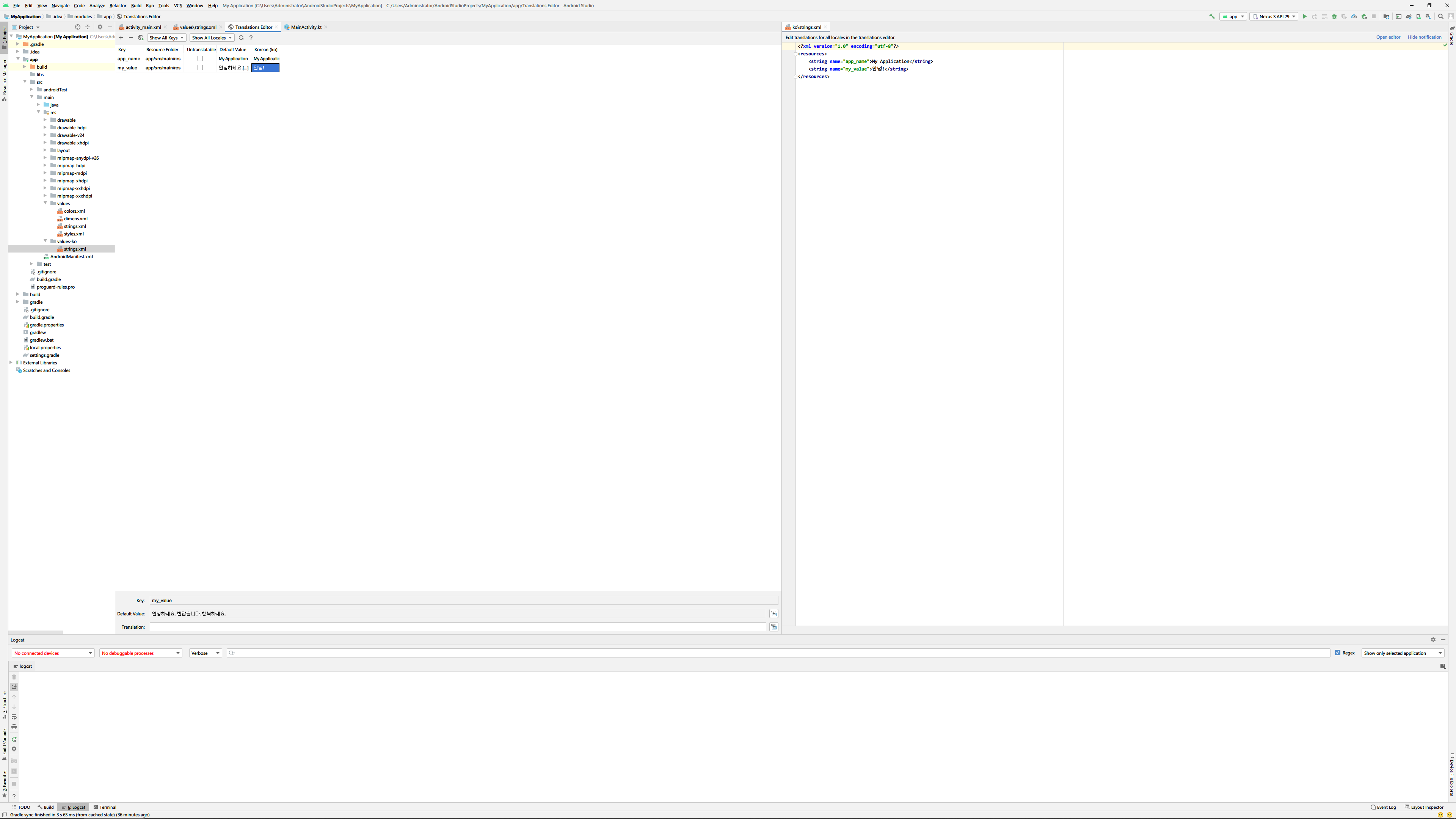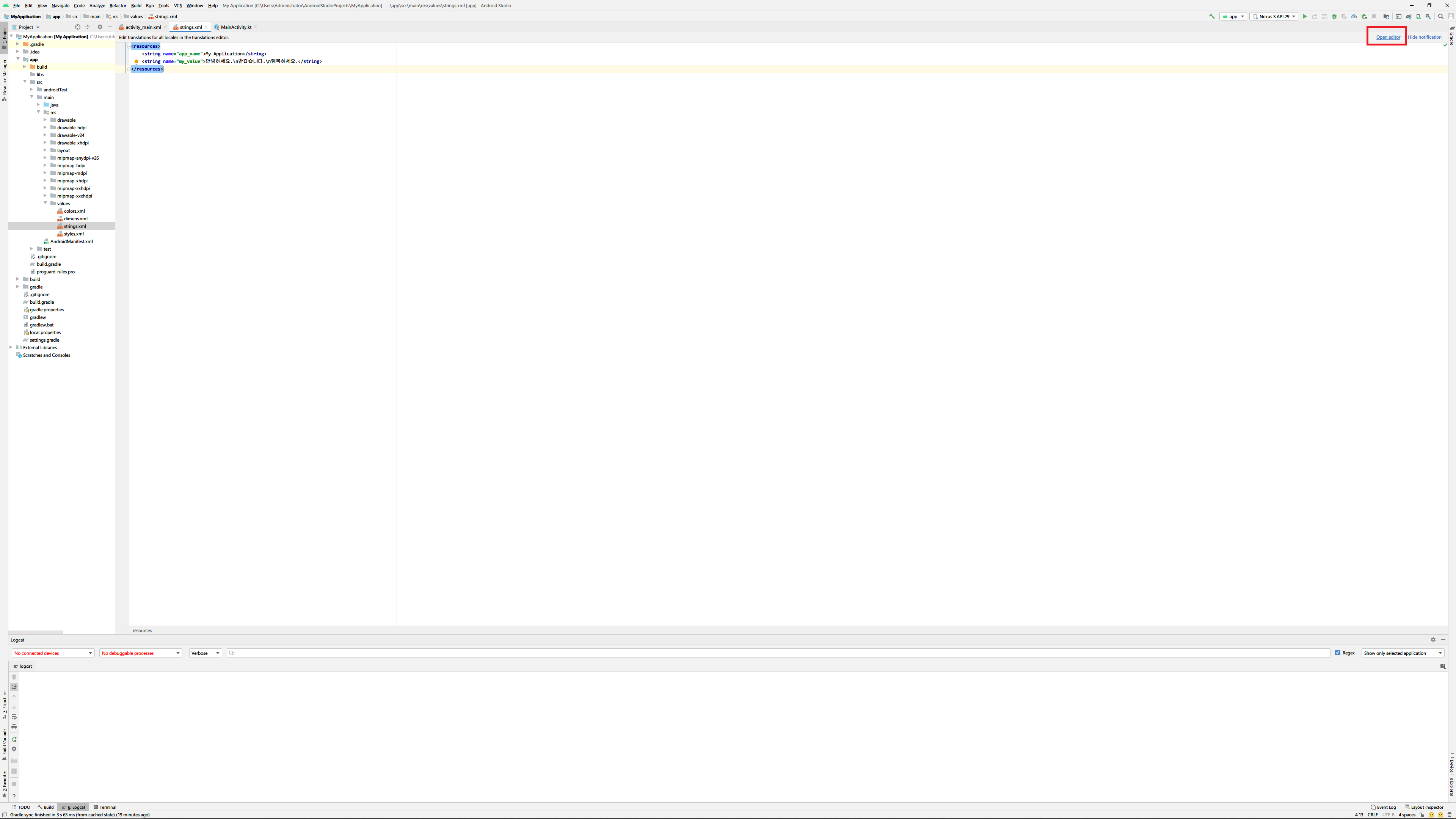 Translations Editor에서 추가된 컬럼에 내용을 입력하고 국가별 value폴더 안의 strings.xml을 열어보면 동일한 내용이 추가되어 있음을 알 수 있습니다.