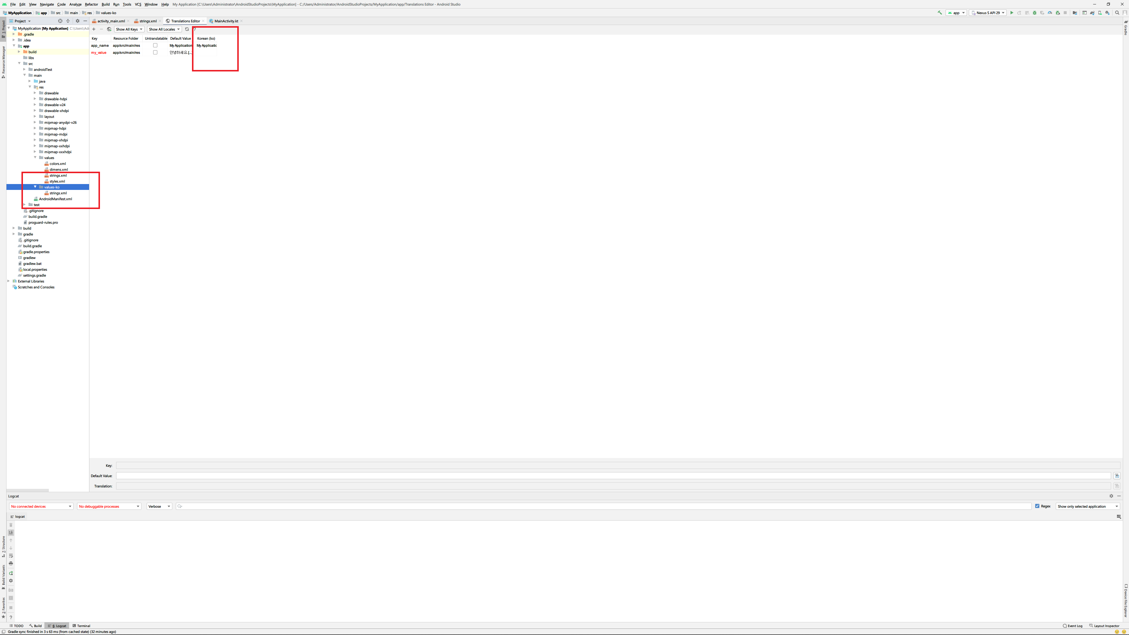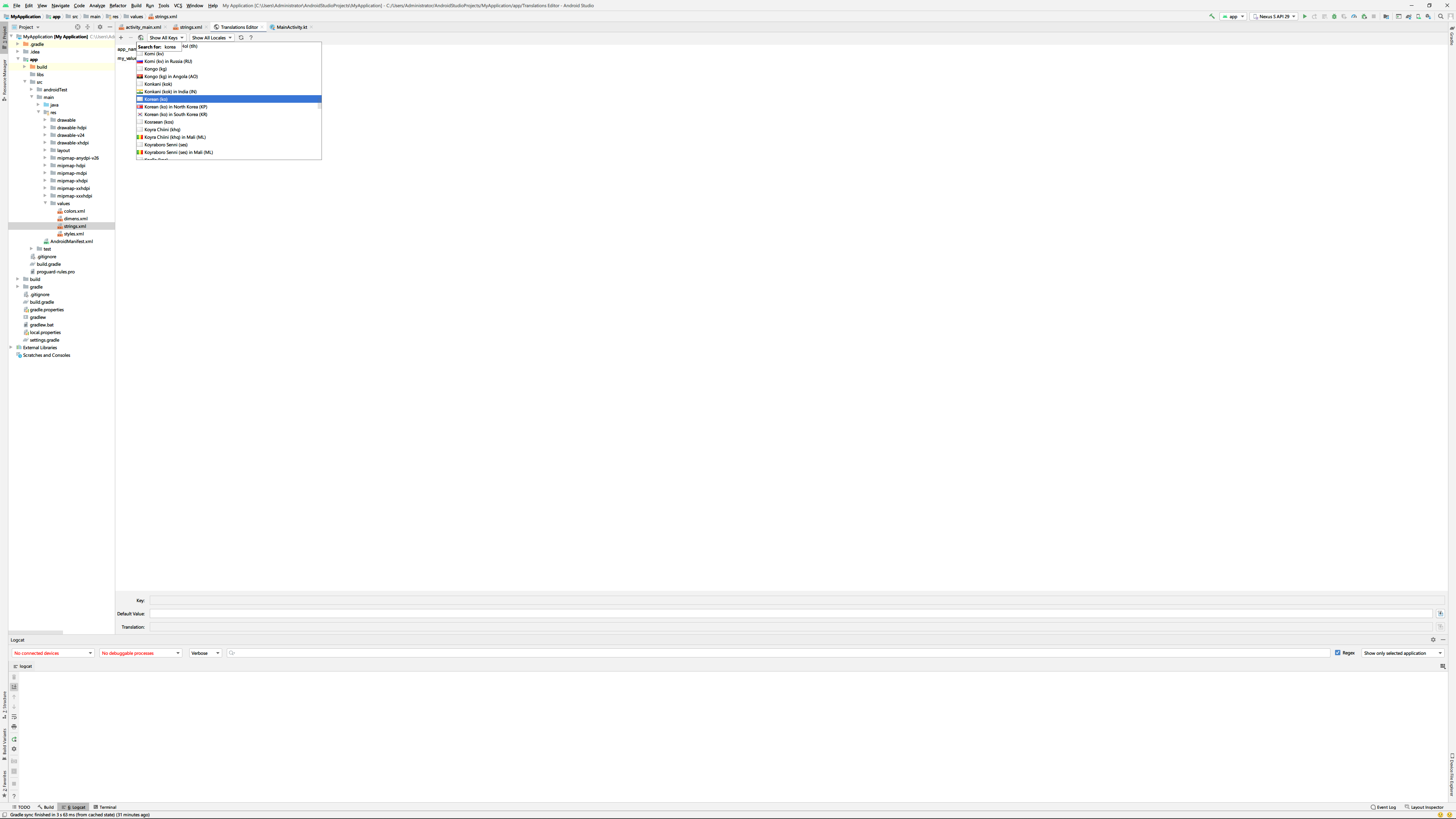 여기서 korea처럼 특정 국가를 선택하고 나면 다음과 같이 2가지 변화가 생깁니다. 첫번째는 특정 국가의 이니셜이 붙은 새로운 value폴더가 생성된다는 것과 선택한 국가명으로 Translations Editor안에서 새로운 컬럼이 생성된다는 것입니다.