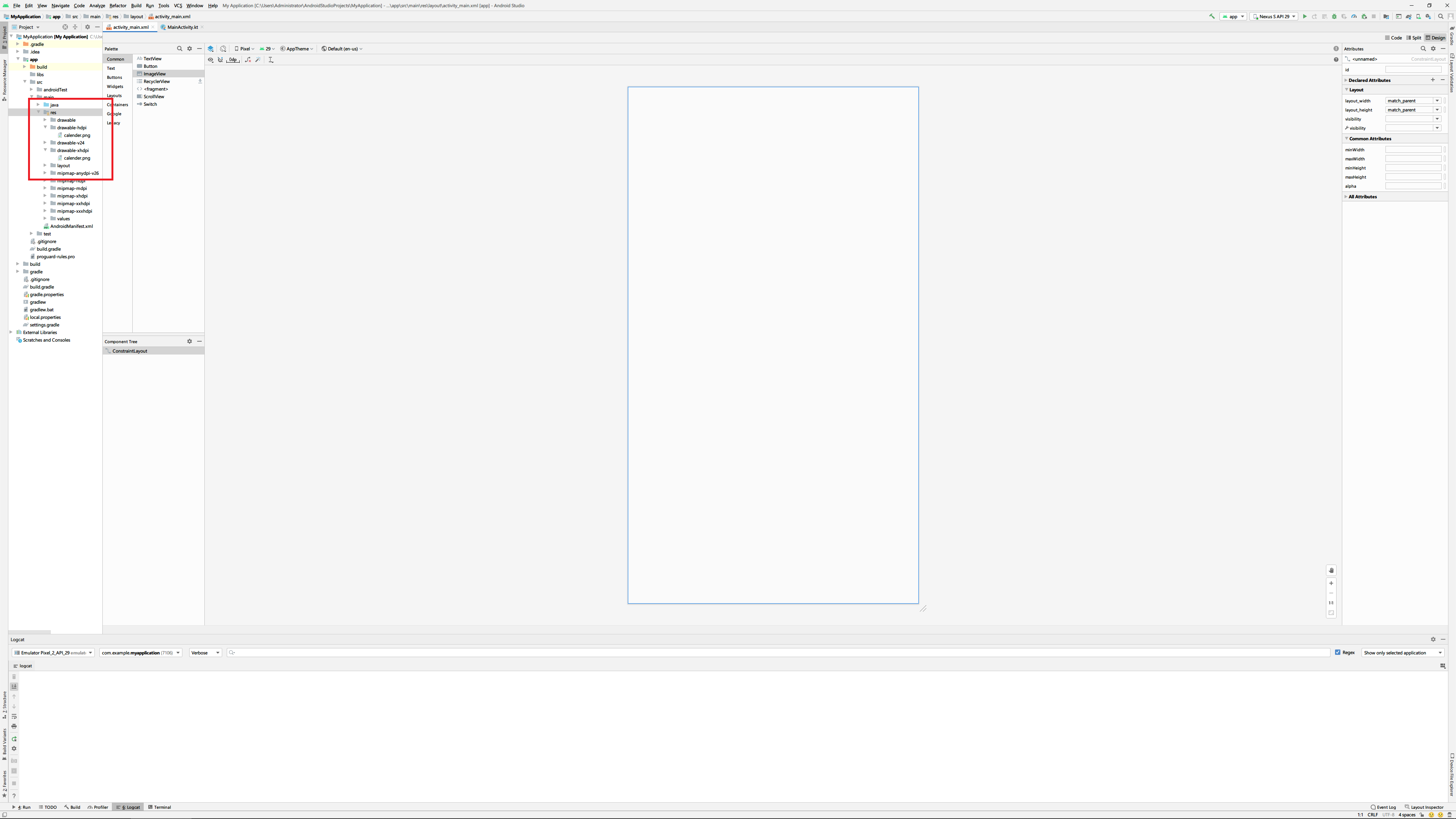 디렉터리를 위와 같이 나누고 각각 해상도에 맞는 이미지를 넣게 되면 앱이 작동하는 스마트폰의 해상도에 따라 각각의 디렉토리에 들어간 이미지가 적절하게 사용됩니다. 예제를 테스트해보기 위해 각각의 디렉터리에 calender.png라는 이미지를 넣어두고 imageView위젯으로 해당 이미지를 표시하도록 해보겠습니다.