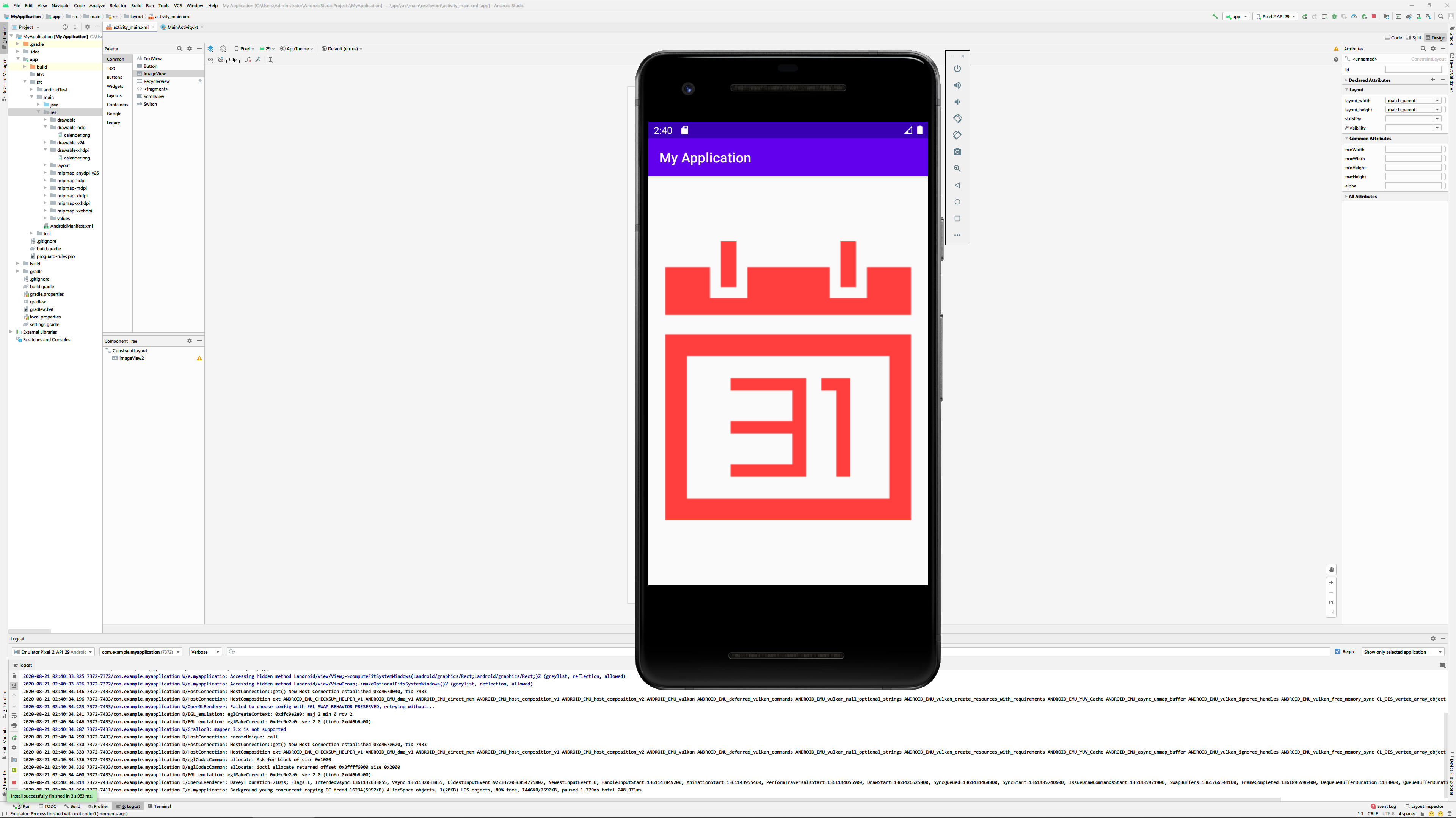 아래 화면은 에뮬레이터로 사용된 Pixel 2에서의 실행화면입니다. Pixel 2는 1920x1080의 해상도를 가지고 있으며 화면 표시에 사용된 calender.png이미지는 drawable-xhdpi 디렉터리의 이미지입니다.