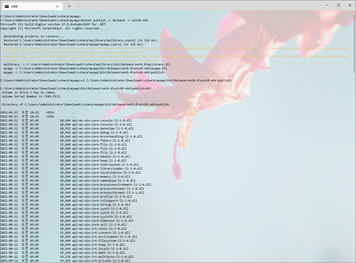 위 명령은 이전 명령에서 '--self-contained=false'만을 제외한 것인데 이 방식은 App에 필요한 모든 요소를 exe나 dll안에 포함 시키게 되므로