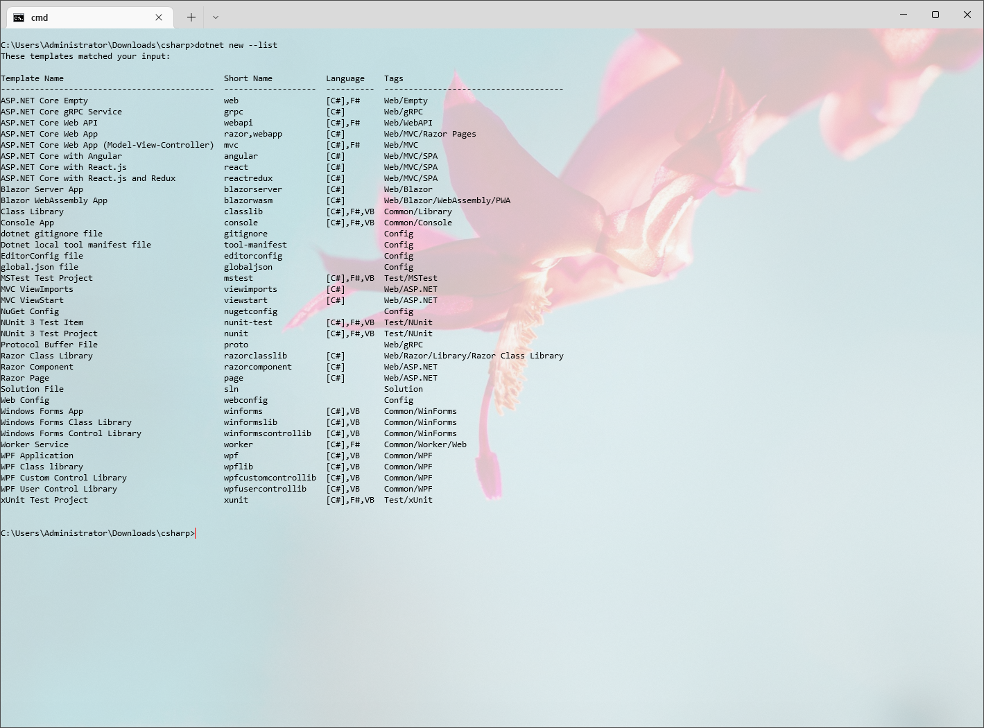 | dotnet new --list (혹은 dotnet new -l) |