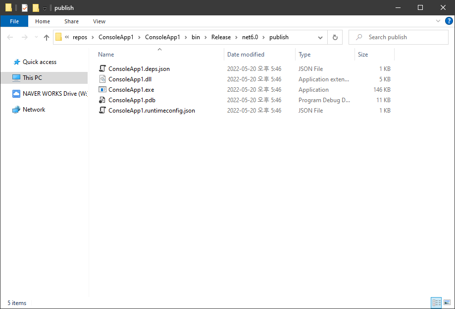 SingleFile배포는 말 그대로 하나의 단일 파일로 App을 배포한다는 것을 뜻하며 실제 위 명령으로 App의 배포본을 생성하는 경우 실행 가능한 형태의 exe와 pdb파일, 이렇게 2개의 파일만 생성됨을 알 수 있습니다.