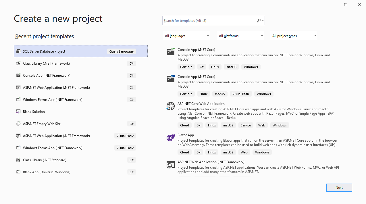 우선 Visual Studio에서 SQL Server Database Project를 생성합니다.
