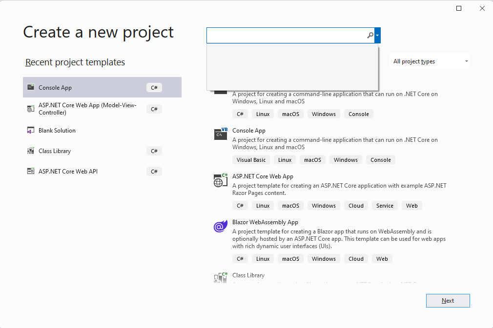 예를 들어 Visual Studio 2022에서 새로운 project를 생성할때 표시되는 'Create a new project'화면을 보면 Template을 검색하기 위해 입력했던 단어들이 표시되는걸 볼 수 있는데