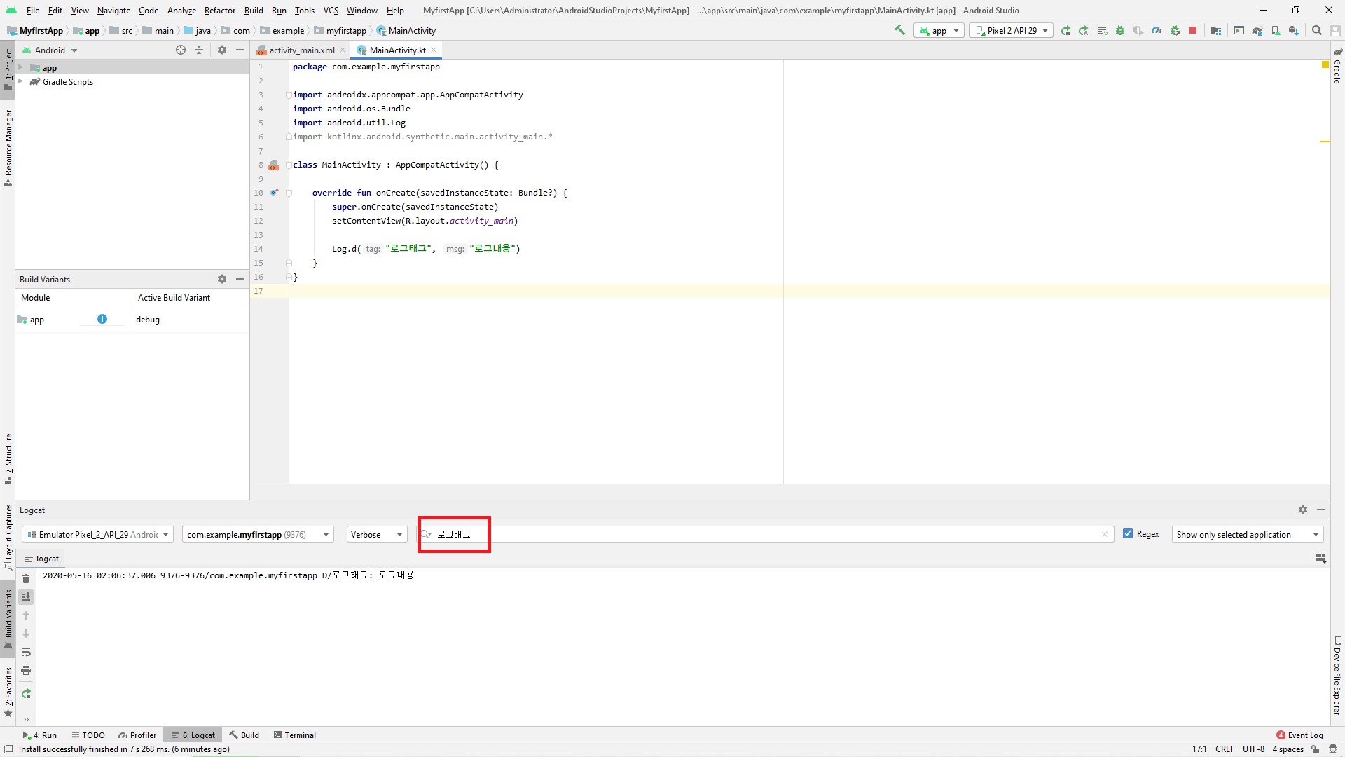 위와 같이 d함수를 사용하고 난 뒤 실제 로그를 확인해 보려면 앱을 실행 후 android studio에서 하단에 Logcat을 클릭합니다.