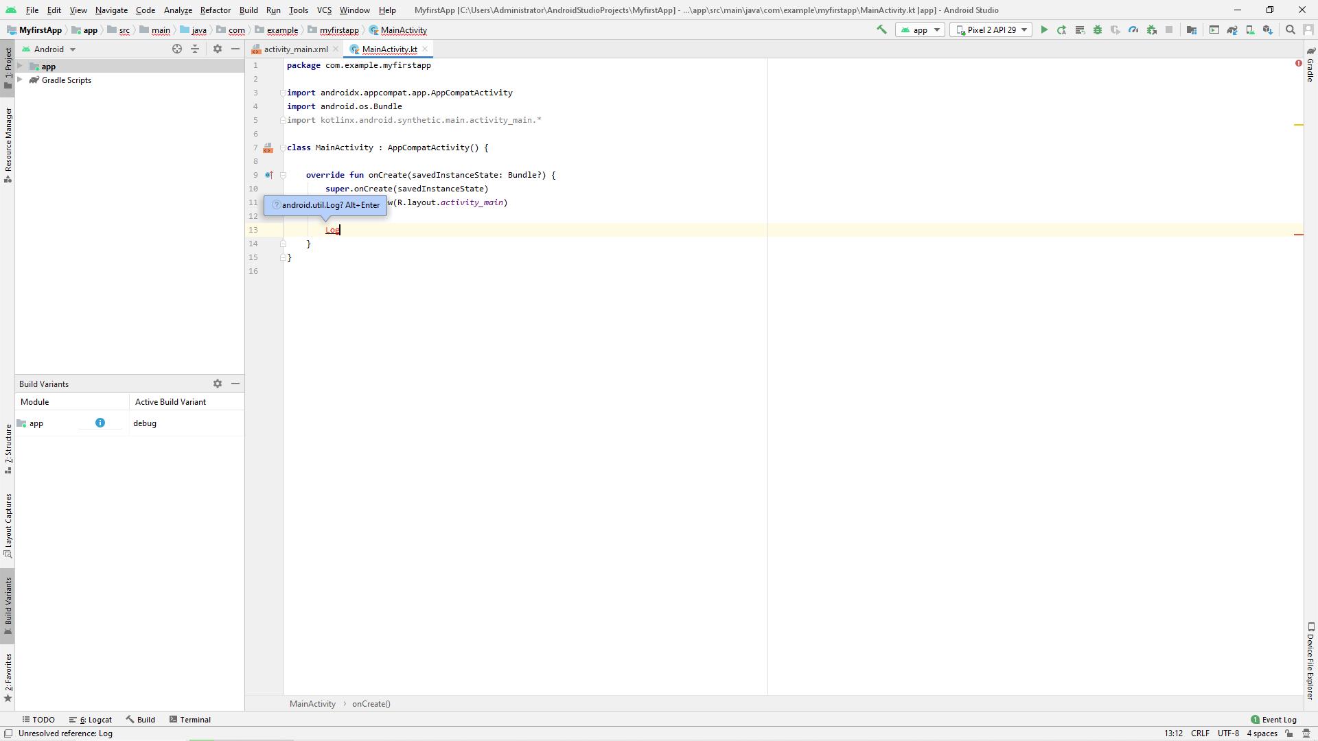 Log를 입력하고 나면 보시는 바와같이 글자가 붉은색으로 표시되며 이를 클릭하면 Log위에 'android.util.log? Alt+Enter'라는 메시지가 보이게 됩니다. 이는 Log클래스가 Import 되지 않았기 때문인데 안내에 따라 Alt + Enter키를 눌러 Import 시켜주면 됩니다.