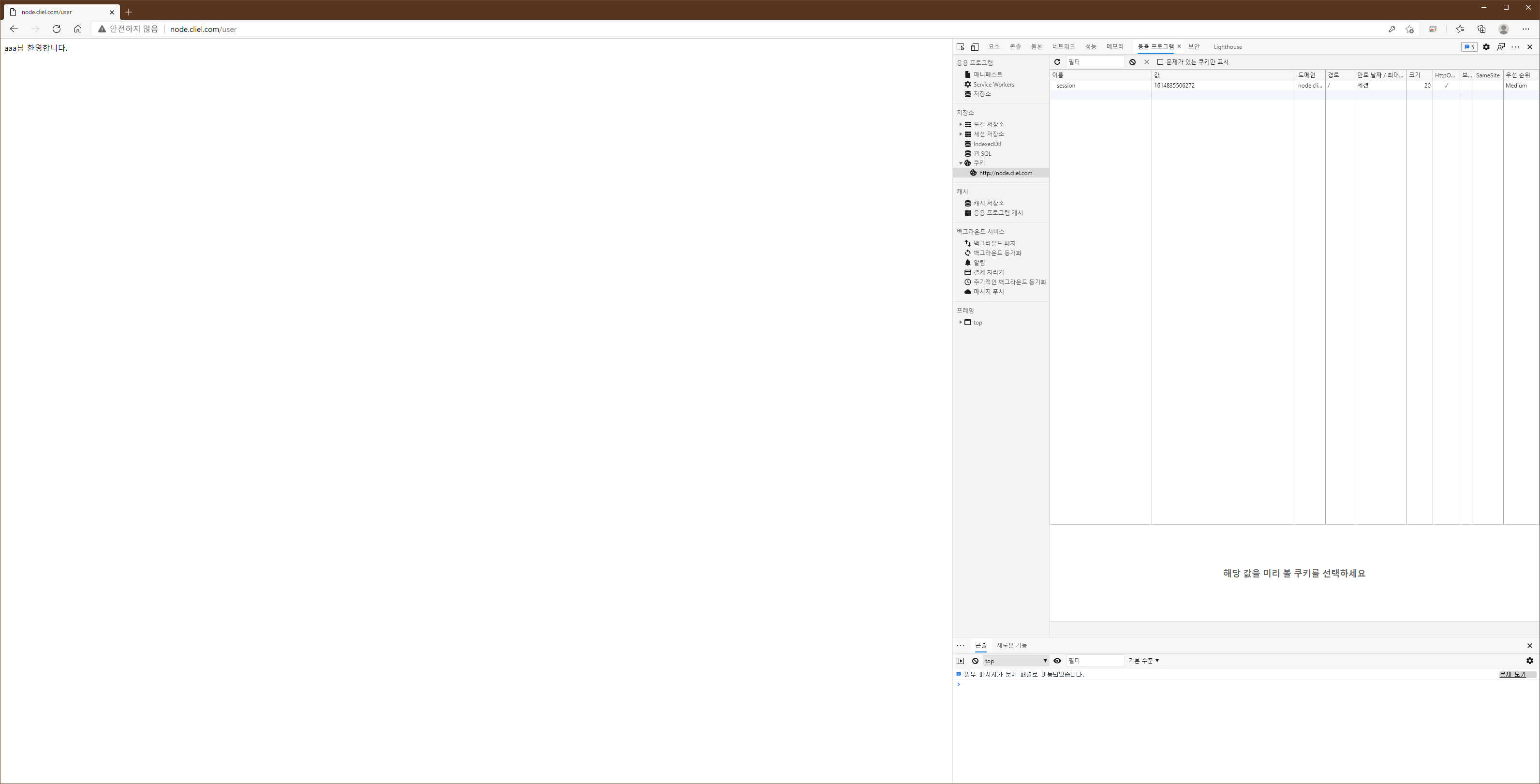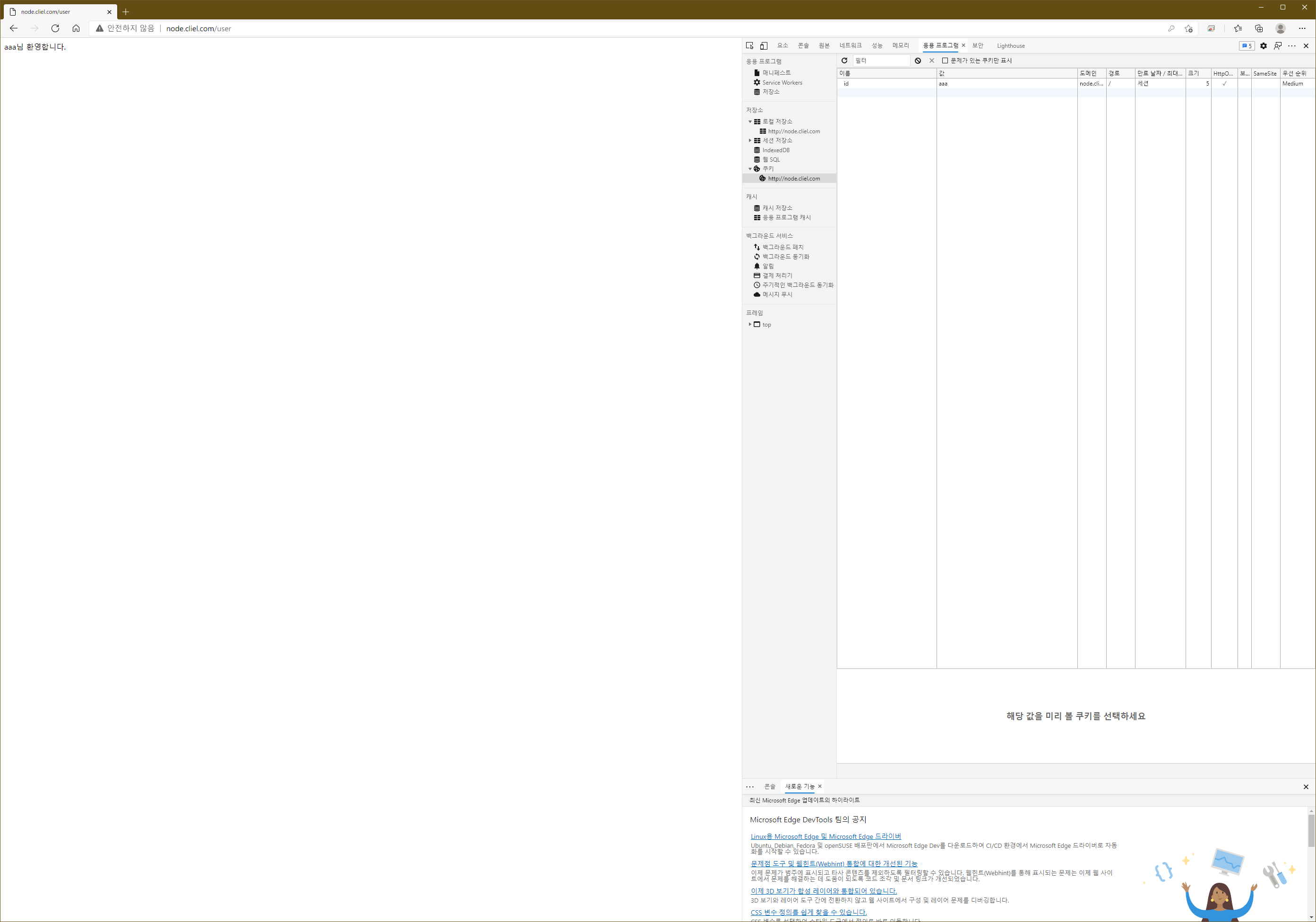 /user에서는 실제 쿠키값이 있는지를 확인한 후 쿠키값이 존재한다면 '-님 환영합니다.'라는 표시를, 없다면 사용자를 /login페이지로 돌려보냅니다.